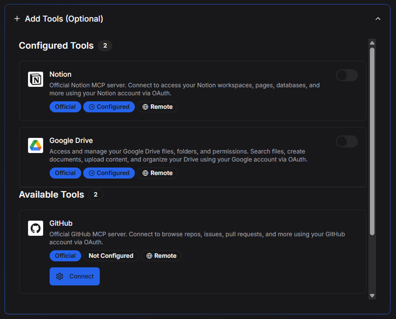 [!NOTE] Why is this separate? By decoupling global connection from agent assignment, you maintain security and control. You might have 10 different tools connected to your account, but you only want your "Writer Agent" to have access to Google Docs, not your GitHub repository.