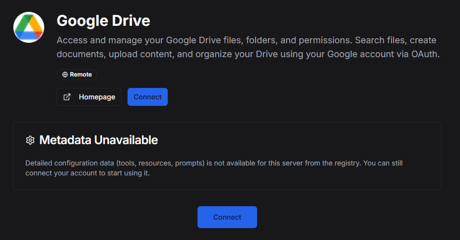 - Find the MCP server you want to connect (e.g., "Google Drive MCP").